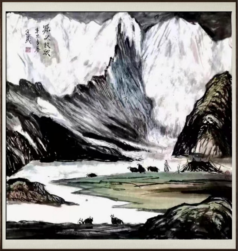 李进茂先生以青藏高原为生活,创作素材,以造化为师,写尽青藏高原的高远与神秘,他以大视野的广角镜头语言,记录着青藏高原的万象神姿:从近、中、远三景透视中,展现着苍穹中翱翔的雄鹰。如剪影般的耗牛群,远处牧人的毡房在光影与笔墨的互为表达中,让我们看到青藏高原的风骨沧桑与壮美神秀。