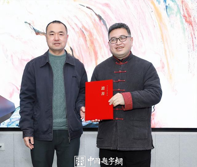 令狐伟鹏先生将代表作品《壶口雄风图》捐赠给人美美术馆收藏,北京人美艺术展览有限公司总经理张朝生向其颁发“收藏证书”。